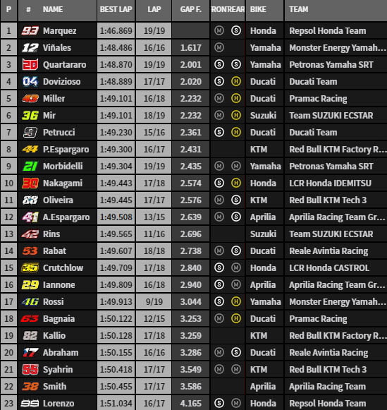 À la fin du premier run, Marc Márquez précède toujours de plus d’une seconde Pol Espargaró, Andrea Dovizioso, Maverick Viñales, Jack Miller, Fabio Quartararo, Danilo Petrucci, Joan Mir, Franco Morbidelli et Miguel Oliveira. Suivent Mika Kallio, Álex Rins, Bradley Smith, Cal Crutchlow, Francesco Bagnaia, Tito Rabat, Takaaki Nakagami, Andrea Iannone, Hafizh Syahrin, Valentino Rossi, Jorge Lorenzo, Aleix Espargaró et Karel Abraham.