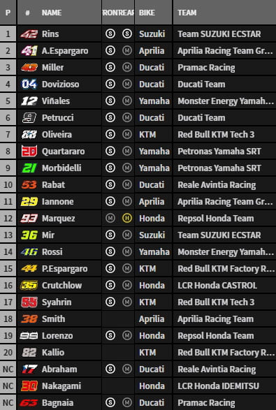 Voici les références disponibles, au moment où les 23 pilotes (Bradley Smith est wildcard pour Aprilia) de la catégorie reine se préparent pour cette première séance d’essais libres de 45 minutes: