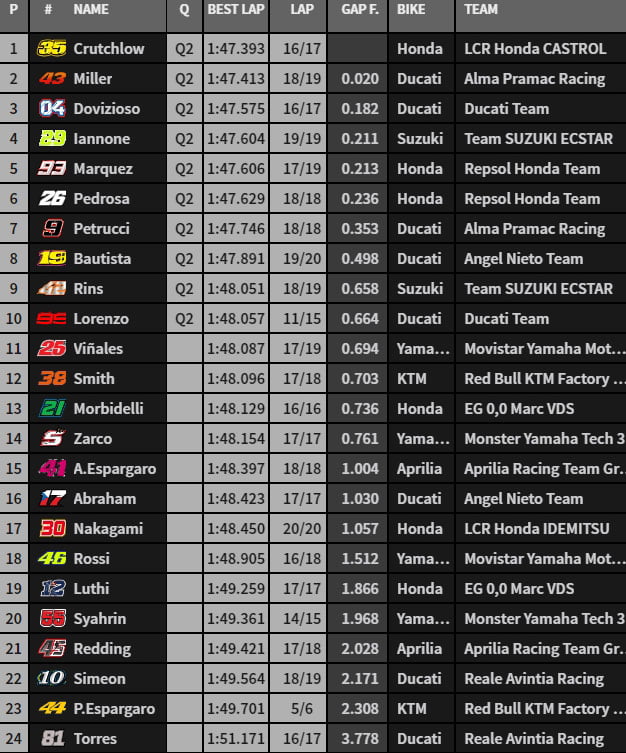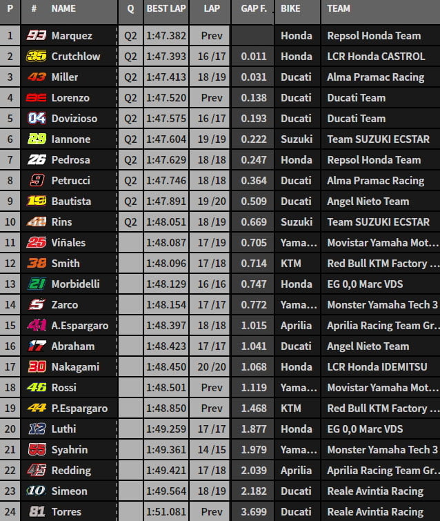 Les pré-qualifiés pour la Q2 sont donc Marc Márquez, Cal Crutchlow, Jack Miller, Jorge Lorenzo, Andrea Dovizioso, Andrea Iannone, Dani Pedrosa, Danilo Petrucci et Álvaro Bautista. Aucune Yamaha ne figure dans cette liste.