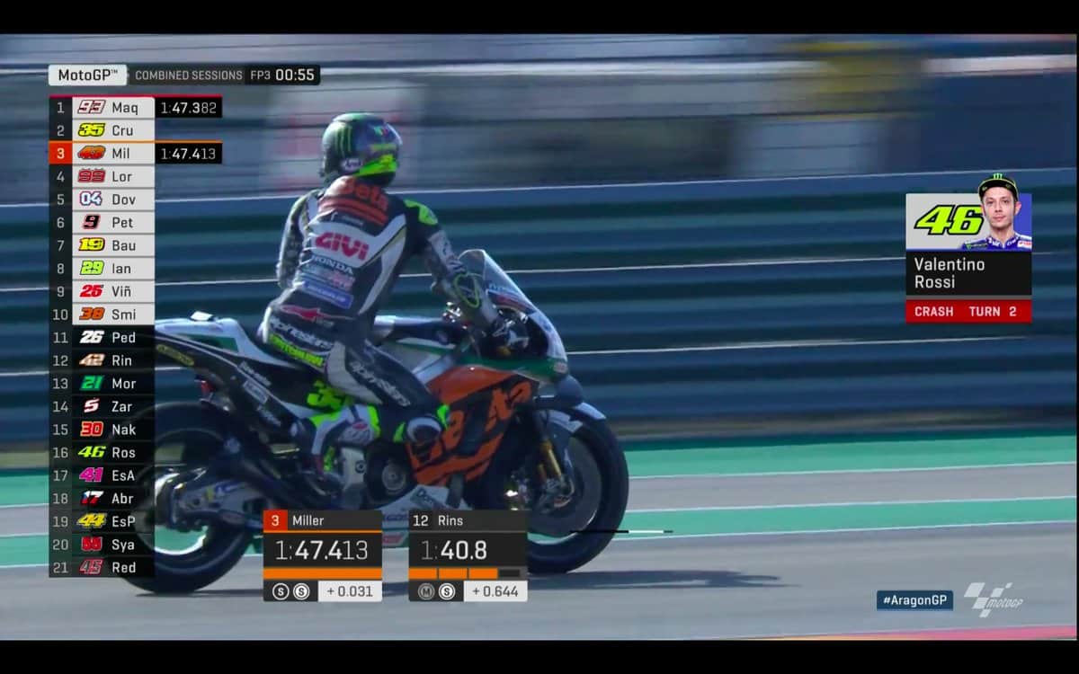 Cal Crutchlow est maintenant en 1’47.393 quand Valentino Rossi chute au virage deux alors qu’il occupait la 18e position en séance.