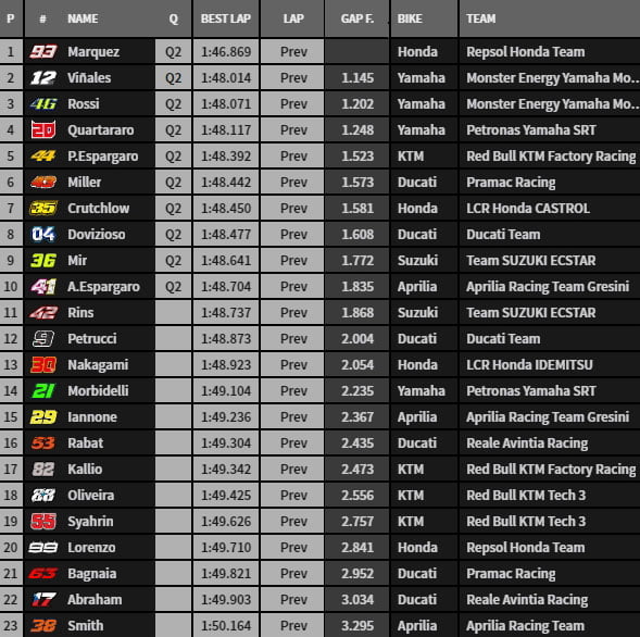 Ce n’est pas complètement le cas pour Alex Rins, Danilo Petrucci, Takaaki Nakagami, Franco Morbidelli et Andrea Iannone qui devront se départager avec quelques autres lors de la Q1 pour espérer pouvoir figurer sur les quatre premières lignes de la grille de départ dimanche.