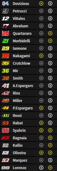 Voici les références disponibles, au moment où les 23 pilotes (Bradley Smith est wildcard pour Aprilia) de la catégorie reine se préparent pour cette session de travail: