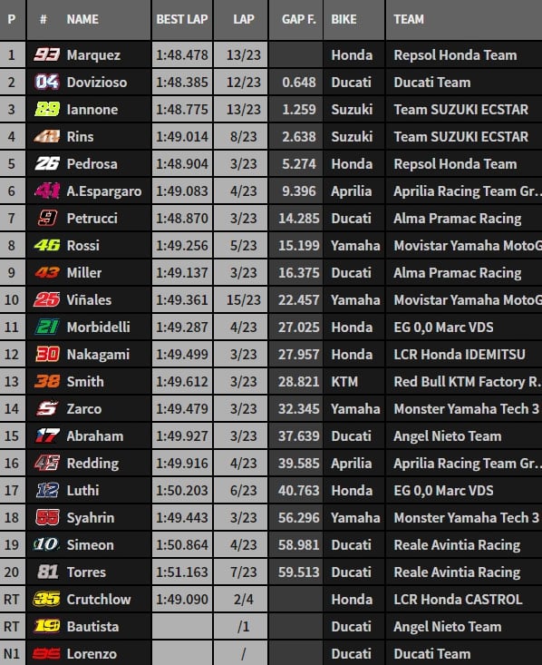 Andrea Iannone : « oui, je pense c’était une très bonne course pour nous, et quoi qu’il en soit, cela a été une belle bagarre. Avant tout, je me suis battu avec mes pneus, et en particulier mon pneu arrière. Il était très important de bien le gérer pendant la course. Durant les essais, je pense que nous avons travaillé dans la bonne direction. Nous avons beaucoup travaillé sur l’électronique et moi, durant la course, j’ai essayé de pas trop attaquer avec l’accélérateur et de ne pas trop faire patiner la moto. Je pense que c’était une très bonne stratégie. Au début, Marc et Andrea avaient un très bon rythme mais, heureusement, je n’avais pas besoin de rouler à 100 % pour les suivre. Je suis resté très proche et quand Alex m’a doublé, la situation a changé un peu. Alex attaquait et j’ai perdu un peu de terrain sur Dovi, Marc et Alex. Mais je suis resté calme et j’ai essayé de gérer les pneus pour la situation de course et, sur la fin, dans les 5 ou 6 derniers tours, j’ai commencé à réduire un peu mon écart. Je pense que c’était une vraiment bonne stratégie et une belle bagarre dans le virage 15. Mais néanmoins, quand j’ai relevé la moto, la Honda et la Ducati étaient très rapides, plus rapides que nous en ligne droite. Je pense que c’est le point négatif de la course d’aujourd’hui, mais c’était quand même une belle course ».