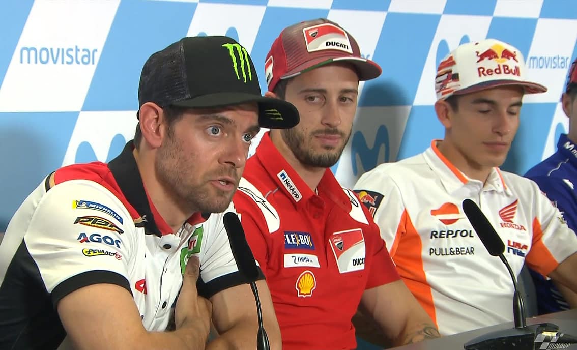 Cal Crutchlow : « comme vous le savez, Jack Miller et moi avons été blâmés parce qu’il ne roule pas. Je n’ai aucune idée du pourquoi ou du comment. J’ai été le premier gars le jeudi, et probablement le seul gars, à dire qu’il fallait lui donner une chance et le laisser rouler. Nous devrions avoir plusieurs gars qui rentrent dans le championnat quand ils en ont l’opportunité. J’ai donc été blâmé mais je n’ai aucune idée du pourquoi. Je pense que la première règle serait que le team ne soit pas assez stupide pour que le pilote qu’il mette sur la moto n’ait pas à payer pour un week-end. Vous pouvez prendre quelqu’un d’expérience ou quelqu’un de Moto2 ou d’un constructeur, quelque chose comme ça. Mais oui, je pense que l’on devrait aussi regarder la règle des 107 % qu’ils ont mise dans le passé pour pouvoir piloter ces motos. Car ce n’est pas seulement pouvoir piloter une moto, car tout le monde peut piloter une moto s’il pour le week-end. C’est difficile à piloter, ce n’est pas seulement grimper sur quelque chose de facile à piloter. La MotoGP est la catégorie reine, la moto, le moteur, le châssis. Je pense qu’elle nécessite une sorte de règle ».