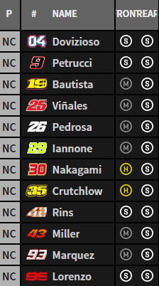 Pneus tendres à l’arrière pour tout le monde, dur à l’avant pour Cal Crutchlow et Takaaki Nakagami, tendres pour Jorge Lorenzo, Andrea Dovizioso, Danilo Petrucci et Alex Rins, médium pour les autres.