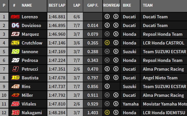 Les choses se décantent jusqu’à la dernière minute où Jorge Lorenzo et Andrea Dovizioso améliorent leurs chronos et s’empare des 2 premières places, tandis que Cal Crutchlow chute au virage numéro 2.