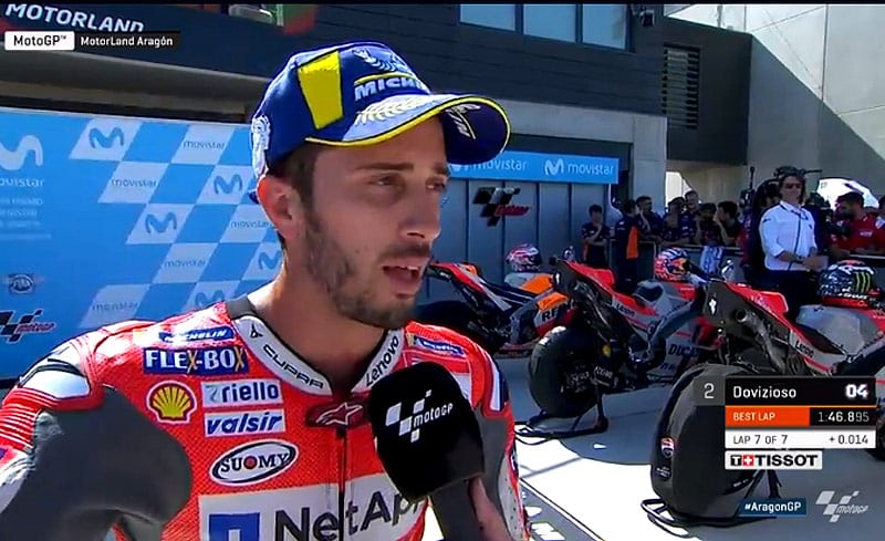 A peine descendu de sa Ducati GP18 officielle après avoir obtenu la 2e position sur la grille de départ du Grand Prix d’Aragon malgré avoir dû doubler Alvaro Bautista, Andrea Dovizioso s’est confié au micro du site officiel MotoGP.com avec une certaine confiance…