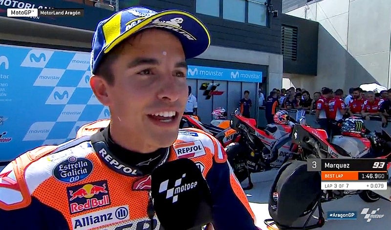 A peine descendu de sa Honda RC213V officielle après avoir obtenu la 3e place sur la grille de départ du Grand Prix d’Aragon au côté des deux Ducati officielles, Marc Marquez s’est confié au micro du site officiel MotoGP.com.
