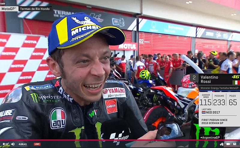 A peine descendu de sa Yamaha M1 officielle après avoir obtenu de haute lutte la deuxième place du Grand Prix d’Argentine, Valentino Rossi s’est confié devant la caméra du site MotoGP.com, avec la joie d’un jeune homme...