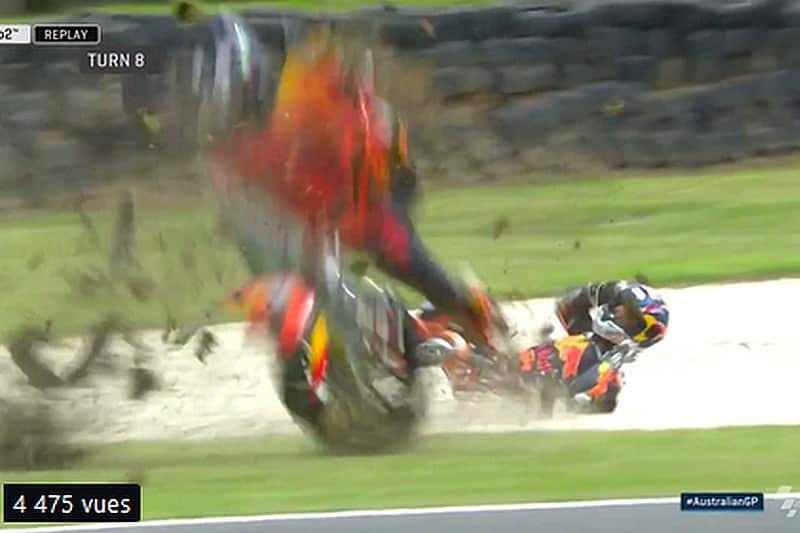 Niki Tuuli (SIC Racing Team) part à la faute devant Isaac Viñales (Forward Racing Team) qui ne peut l’éviter et lui roule dessus. L’Espagnol est filmé, il s’est relevé, en revanche nous n’avons pas de nouvelles du Finlandais. Le drapeau rouge n’ayant pas été agité, tout laisse à croire qu’il va bien. Quelques instants plus tard, c’est Brad Binder (Red Bull KTM Ajo) qui est victime d’une chute impressionnante. Le Sud-Africain fait un high side et chute à haute vitesse tandis que sa moto s’envole littéralement dans les airs ! Heureusement, elle ne lui retombe pas dessus et il se relève immédiatement.