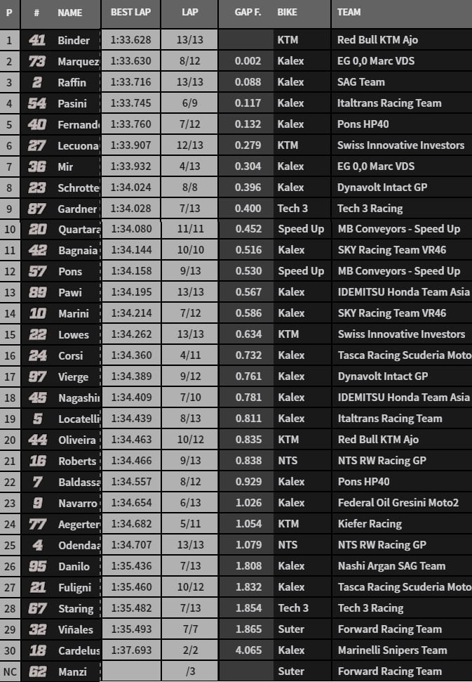 On notera les belles performances de Jesko Raffin (Kalex, SAG Team) troisième, Iker Lecuona (Kalex, Swiss Innovative Investors) sixième et du local Remy Gardner (Mistral M610, Tech 3 Racing) huitième.
