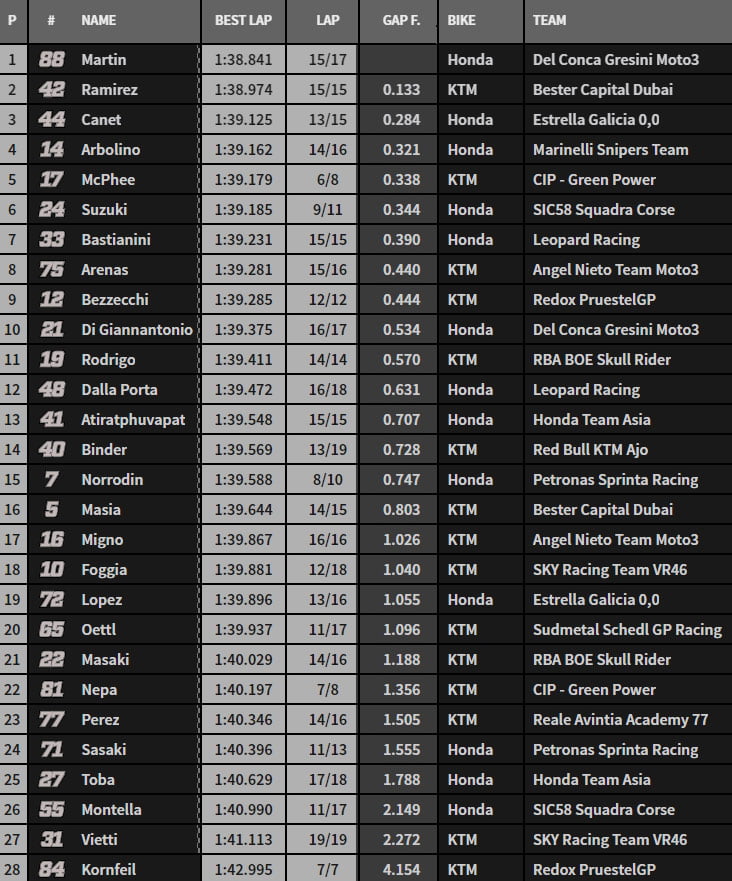 À la mi-séance, Arón Canet (Honda, Estrella Galicia 0,0) s’empare du commandement devant Jorge Martin (Honda, Del Conca Gresini) qui ne porte plus son gant spécial et s’octroie le leadership en 1’39.016 au passage suivant.