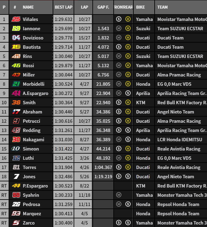 Mais ce sera trop tard. Viñales et Yamaha retrouvent la victoire. Iannone et Dovizioso complètent le podium. Bautista, Rins et Rossi suivent. Miller, Morbidelli, Aleix Espargaró et Smith complètent le top 10.
