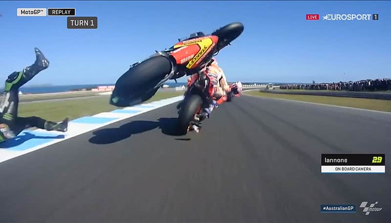 Les 2 motos se sont percutées et la Yamaha de Johann Zarco s’est envolée de façon spectaculaire sur la roue arrière de la Honda alors que le pilote Tech3 entamait une longue glissade.