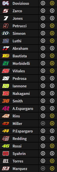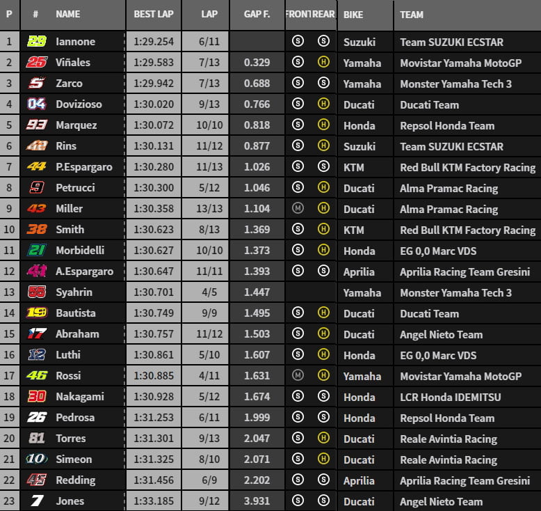 La hiérarchie est alors composée de Andrea Iannone, Maverick Vinales, Johann Zarco, Andrea Dovizioso, Danilo Petrucci, Alex Rins, Jack Miller, Hafizh Syahrin, Bradley Smith et Tom Luthi.