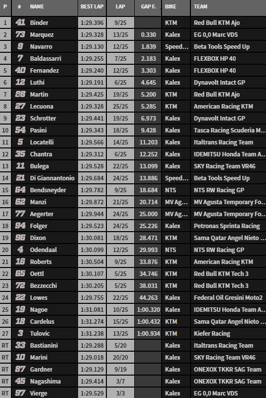 Remy Gardner (Kalex, Onebox TKKR SAG Team), Enea Bastianini (Kalex, Italtrans Racing Team), Álex Márquez (Kalex, Estrella Galicia 0,0 Marc VDS), Tom Lüthi (Kalex, Dynavolt Intact GP), Luca Marini (Kalex, SKY Racing Team VR46), Lorenzo Baldassarri (Kalex, Flex-Box Pons HP 40) et Somkiat Chantra (Kalex, Idemitsu Honda Team Asia) se battent pour la 2e place, mais Remy Gardner réussit à faire la jonction avec Brad Binder à la mi-course et l’Australien porte une première attaque, repoussée, à 12 tours de l’arrivée.