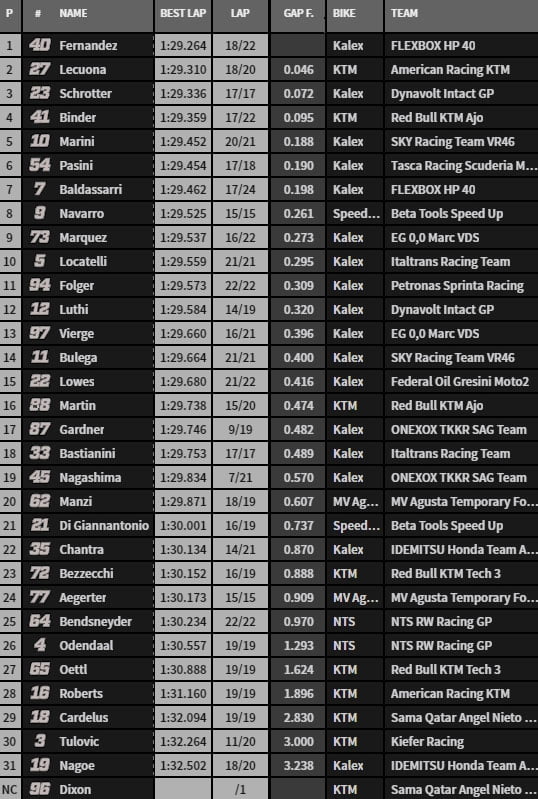 Sous le drapeau à damiers, c’est Fernandez qui garde son meilleur temps devant Lecuona, Schrötter, Binder et Marini. Baldassarri est septième et Álex Márquez neuvième. Lüthi douzième.