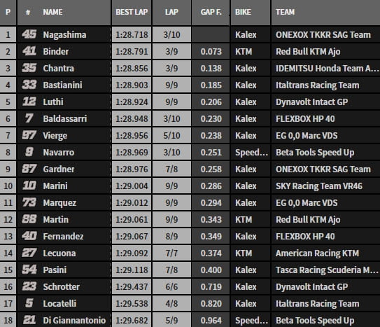 A deux minutes du but, Locatelli chute au virage 4 et on notre qu’Álex Márquez est seulement 12e. Marini est neuvième, devant Pasini et Lüthi. Le dernier assaut du chrono donne la pole position à Nagashima devant Binder et donc Chantra. Bastianini, Lüthi, et Baldassarri sont sur la seconde rangée. Vierge mène le reste du peloton où l’on trouve Marini dixième devant un Álex Márquez absent des débats. Pasini est quinzième. Di Giannantonio 18e mais le châssis Speed Up comptera sur Navarro huitième.