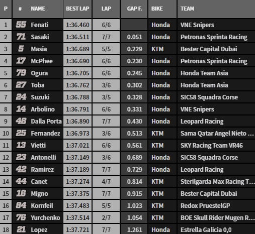 Sous le drapeau à damier, c’est Fenati qui rafle la mise en 1’36.460 devant Sasaki et Masiá qui sera chez Leopard en 2020… McPhee suit avec Ogura et Toba. Arbolino est huitième, devant Dalla Porta. Antonelli est 12e et le grand perdant est Canet, 14e.