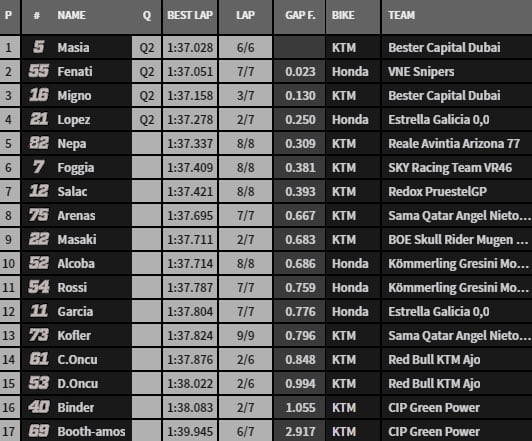 Masiá était la roue recherchée et pur une bonne raison puisque c’est lui qui termine en tête de ces repêchages. en 1’37.028, il clôt les débats. Fenati, Migno et López le suivent vers la Q2.