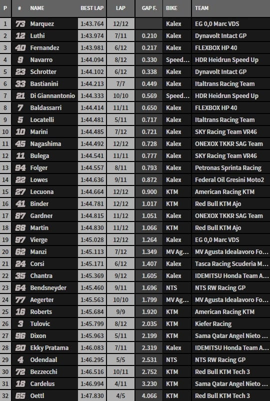 La sensation vient de Fernández qui réalise un 1’43.981 qui est plus rapide que sa performance lors des qualifications… Il met une demi seconde à son équipier Baldassarri neuvième. Lüthi améliore de 7 millièmes et Navarro grimpe quatrième avec la Speed Up. La première KTM est douzième avec Binder.
