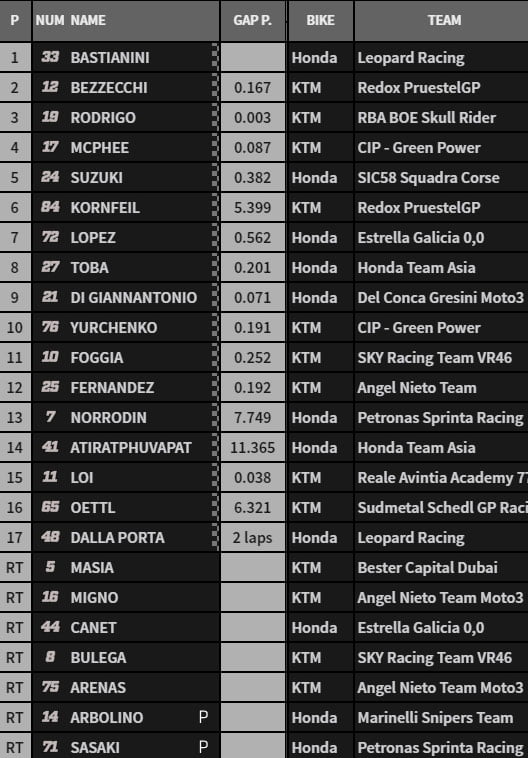 Du coup ce sont les KTM de John Mcphee (CIP – Green Power) et Marco Bezzecchi (PruestlGP) qui se retrouvent en tête d’un groupe comprenant également Gabriel Rodrigo (RBA BOE Skull Rider), Enea Bastianini (Leopard Racing) et Tatsuki Suzuki (SIC58 Squadra Corse).