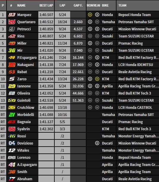 Dans le dernier tour, Marquez concrétise devant Quartararo, Petrucci, Rins, Miller et Mir qui devance la KTM de Pol Espargaró. Zarco est dixième. Guintoli treizième derrière Oliveira.