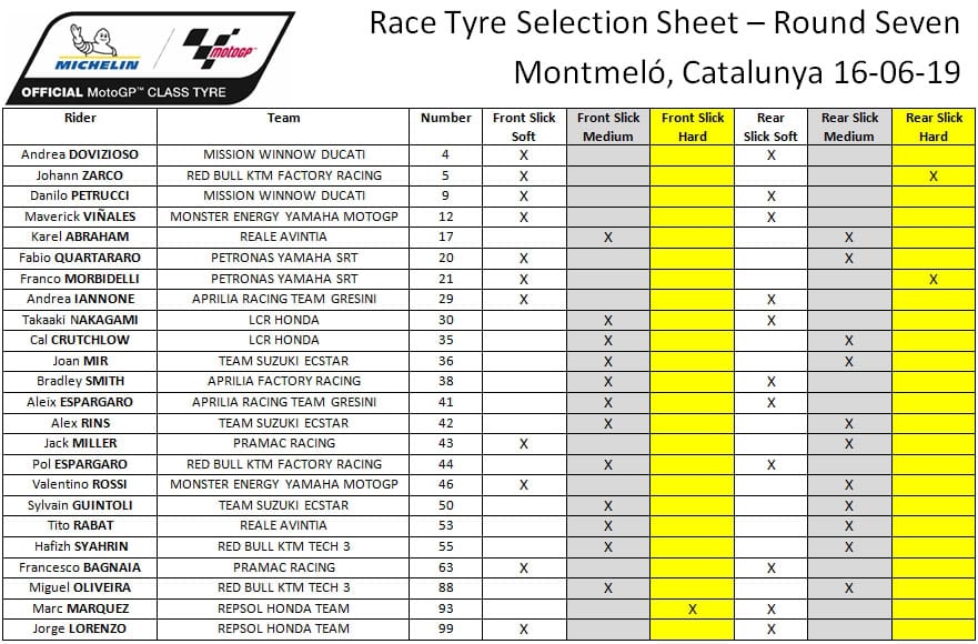 26° dans l’air et 51° sur la piste, les pneumatiques vont souffrir lors des 24 tours de course. Le choix des gommes est diversifié Fabio est en soft medium, Marquez en hard soft, Morbidelli en soft hard, Rossi en soft medium, Dovizioso en full soft comme Vinales et Petrucci. Rins et Crutchlow sont en full medium.