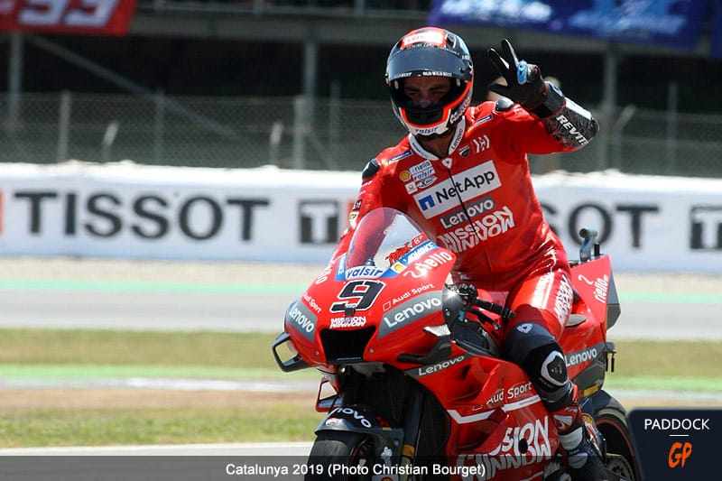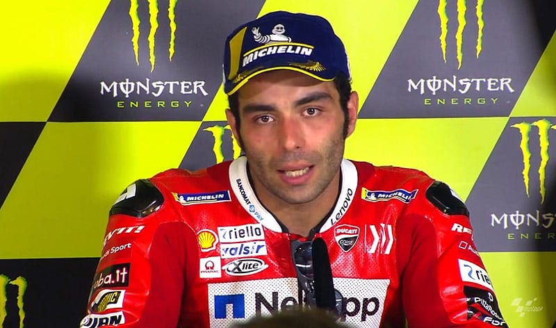Danilo Petrucci : « je suis très heureux de cette 3e place. Comme Marc l’a dit, je n’étais malheureusement pas un des plus rapides de ce week-end. Depuis vendredi matin, nous avons souffert d’un manque de motricité et d’un manque d’adhérence. Mais quoi qu’il en soit, j’ai fait de mon mieux pour résoudre ce problème, j’ai pris un bon départ, et j’étais là, autour de la 4e, 5e ou 6e position. Puis Lorenzo m’a attaqué de façon très agressive. Il essayait de me doubler. Au virage 10, j’étais au milieu du crash et je me souviens : J’ai freiné fort pour arrêter la moto et au même moment Valentino m’a dépassé très très vite. Et Lorenzo également, il conservait sa vitesse dans le virage. Et j’ai touché mais je ne sais pas de qui était la faute. Mais bien sûr, j’ai vu Maverick et Dovi chuter puis j’ai seulement pensé à refermer mon virage. Il y avait alors Marc devant et j’ai essayé de rester avec lui. Je pense que l’écart était d’une demi-seconde et j’ai essayé de rester comme ça, mais Marc était plus rapide d’environ 3 ou 4/10 dixièmes par tour. J’ai beaucoup peiné avec la motricité, en particulier quand Álex et Fabio me mettaient la pression derrière moi. Je savais qu’Álex était rapide et il a essayé de me doubler à plusieurs reprises, mais j’ai pu lui répondre 2 fois au bout de la ligne droite, puis au virage 4 il s’est glissé à l’intérieur et nous nous sommes touchés très fort. Alors je me suis dit « OK, peut-être qu’il va m’aider à remonter », mais j’ai vu qu’il avait vraiment des problèmes et je me suis dit « OK, on est tous dans le même bateau ». J’ai donc essayé de l’attaquer à nouveau mais vers la fin, Fabio était très très rapide. Je restais là mais il était un peu plus rapide sur un tour, et à 3 tours de l’arrivée, je me suis dit « OK, la 3e position c’est bien ». Je pense que c’est également bien pour le championnat et je suis très heureux ».