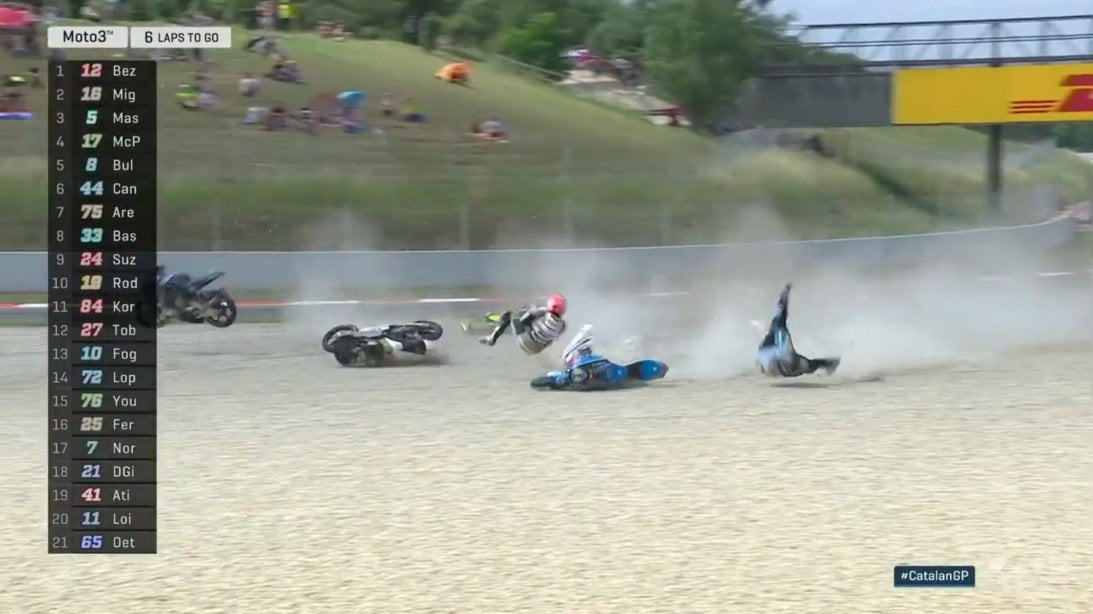 L’autre accrochage majeur de Montmelo, qui était en Moto3 avec un Masia qui a fait de Migno sa victime en évitant de peu McPhee et Bezzecchi n’a en revanche suscité aucune sanction de la part des officiels.