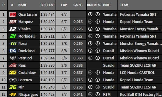 A 2 minutes de la fin de séance, Maverick Viñales s’impose provisoirement en 1’39.710 mais Fabio Quartararo allume les 3 premiers secteurs en rouge et conclut son tour en 1’39.484, meilleur temps du week-end et pole position à la clef !