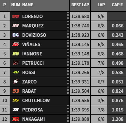 Jorge Lorenzo : « j’ai été un peu déçu avec le premier pneu car nous avions eu un très bon week-end et ce pneu ne fonctionnait pas. Il ne montait pas en température, en particulier à gauche, et comme il n’avait pas d’adhérence, je ne pouvais pas attaquer. J’ai dû rester calme car il était très facile de chuter sans adhérence, donc je me suis dit « OK, Jorge, attend le 2e pneu et attaque davantage ». Et c’est ce qui s’est passé. Quand j’ai mis le 2e pneu, il y avait beaucoup plus d’adhérence et j’ai pu faire un tour presque parfait. J’ai pu beaucoup attaquer dans le milieu des virages, en relâchant les freins très tôt pour avoir une très grande vitesse de passage. Je suis donc très heureux, c’est ma première pole position avec Ducati, et nous verrons ce qui se passera demain ».