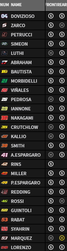 La plupart des pilotes ont opté pour une combinaison pneumatique tendre/tendre mais on observe que Marc Marquez conserve son pneu dur arrière.