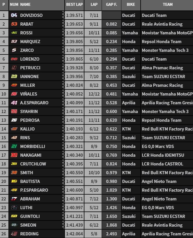 | FP4 | 1’45.194 Marquez | 1’45.486 Pedrosa | 1’39.708 Iannone |