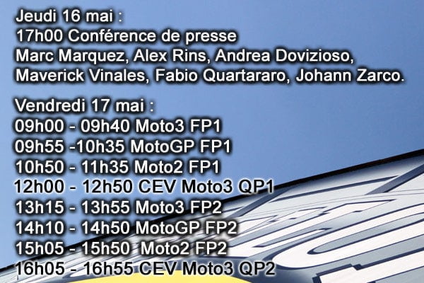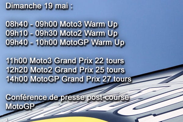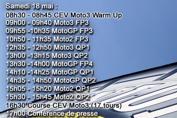 Conforme aux horaires européens, ce Shark Helmets Grand Prix de France se distingue néanmoins par la présence de 2 catégories supplémentaires, l’International Handy Race dont la course se déroulera le samedi à 17h45 sur 8 tours, et le Championnat du monde junior FIM Moto3 qui se disputera sur 17 tours le samedi à 16h30.