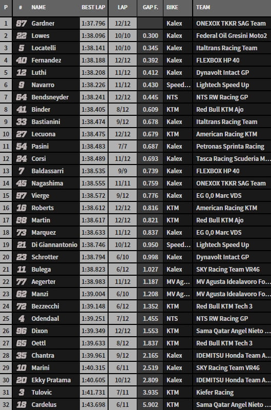 A force de pousser, Sam Lowes finit par chuter au virage 9 et dans la dernière minute. Gardner en profite pour signer un 1’37.796, le seul chrono sous les 1’38. Lowes, Locatelli, Fernandez et Lüthi suivent. Navarro est sixième. Pasini onzième, Baldassarri treizième et Schrötter vingtième.