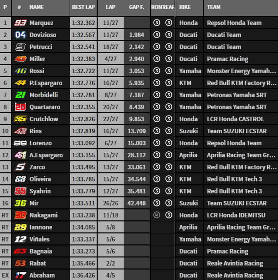 Fabio passe Lorenzo à neuf tours du terme. Le Majorquin contre-attaque néanmoins. Pour l’honneur avant de rendre les armes. Nakagami chute au virage 11. Devant, Dovizioso voit revenir sur lui Miller et Petrucci… Qui passe Miller. Márquez est maintenant à 4s… Quartararo bat le record de piste et vise la huitième place de Crutchlow. Rossi a quant à lui les Ducati dans le viseur. Pol Espargaró est un excellent sixième.