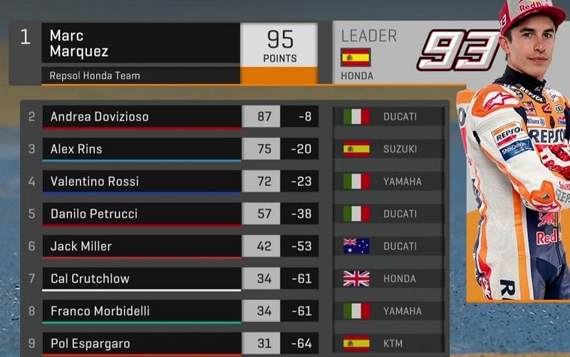 Parti de la quatrième ligne ce dimanche, en compagnie des Yamaha de Fabio Quartararo et Maverick Viñales, Espargaró réalisait un départ fantastique qui lui permettait de boucler le premier tour en sixième position ! Il gagnait même une place au tour suivant en doublant Franco Morbidelli. Mais Danilo Petrucci le passait lors de la boucle suivante, et finalement Pol terminait sixième à moins de trois secondes du cinquième Valentino Rossi (ce qui est déjà en soi un exploit) et devant les deux Yamaha Petronas de Franco Morbidelli et Fabio Quartararo, la Honda officielle de Cal Crutchlow, la Suzuki d’Álex Rins et la Honda Repsol de Jorge Lorenzo. Beau tableau de chasse !