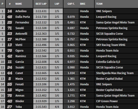 Sasaki et Antonelli clos le top5. Canet est treizième en 2.13.018s. Fenati est dans les profondeurs du classement, en quatorzième position, il tourne en 2.13.106s.