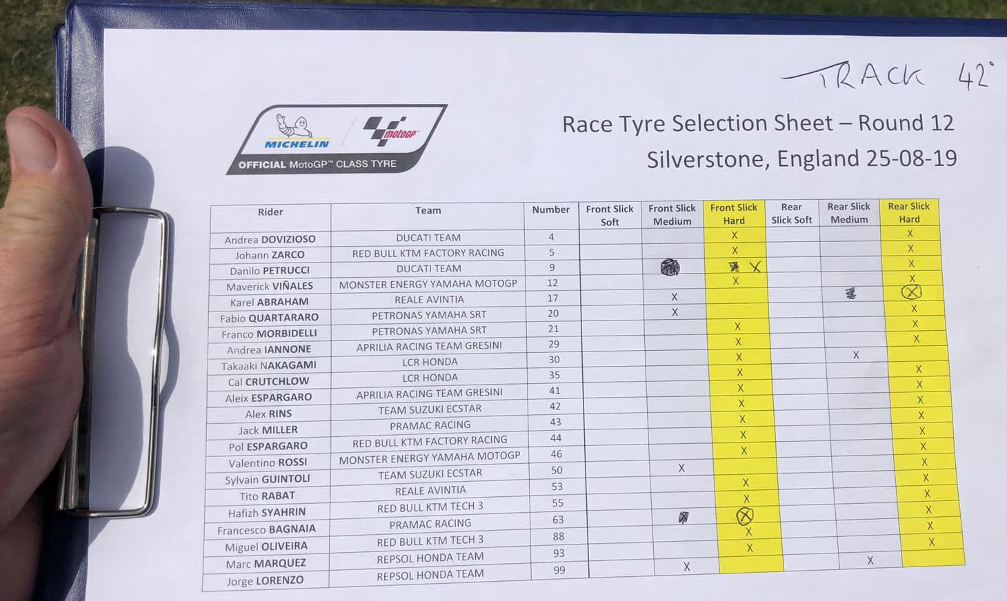 Michelin nous partage le choix des pneus sur la grille : tout le monde en dur arrière sauf Takaaki Nakagami et Jorge Lorenzo