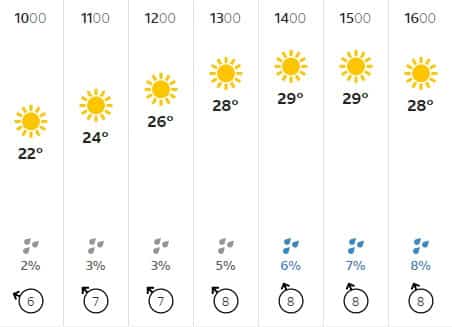 Sur le papier, la course qui va se dérouler avec des températures de 31° dans l’air et 42° au sol s’annonce tout simplement exceptionnelle ! A noter toutefois que la météo de la BBC est la seule à pouvoir nous prédire à la fois un grand soleil conjointement avec un risque (certes minime de 6%) de pluie ! 🙂
