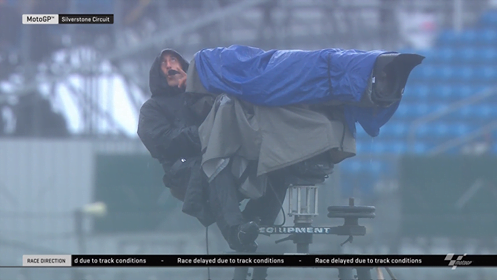 C’est dans une atmosphère bien particulière que s’engage ce douzième Grand Prix de la saison MotoGP. La faute à une piste de Silverstone finalement plus massacrée qu’améliorée par des travaux sur son revêtement qui ont fait plus de mal que de bien. Les bosses étaient l’écueil sur le sec, mais sur le mouillé, un drainage asymptote de zéro dans certains secteurs met en danger les pilotes. Pour faire face à la crise, les horaires ont été chamboulés afin d’éviter autant que faire se peut les averses. Nous voilà donc en poste à 12h30. Au fait, quel temps fait-il ? Il pleut ! 13° sur la piste comme dans l’air… Le départ avancé pour éviter la colère du ciel est un échec…