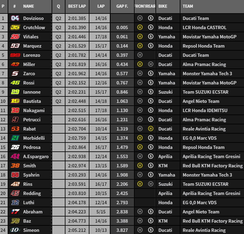 Andrea Dovizioso, Cal Crutchlow, Maverick Vinales, Marc Márquez, Jorge Lorenzo, Jack Miller, Johann Zarco, Valentino Rossi, Andrea Iannone et Álvaro Bautista sont donc pré-qualifiés pour la Q2.