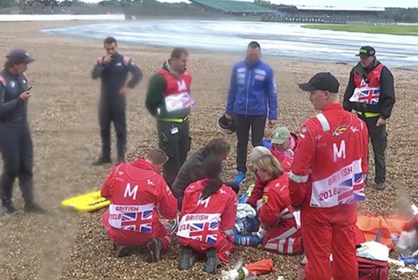 Reste cette piste de Silverstone. Le local de l’étape Crutchlow explique ainsi le déroulé du drame : « sur la ligne droite du hangar, les flaques d’eau étaient énormes et profondes. Cela a rendu les freins en carbone inefficaces. Vous n’aviez aucun frein devant Stower Corner … C’est pourquoi Rins a sauté de sa moto. S’il pleut ici dimanche, il n’est pas possible de courir à cause des flaques d’eau et de l’aquaplaning« .