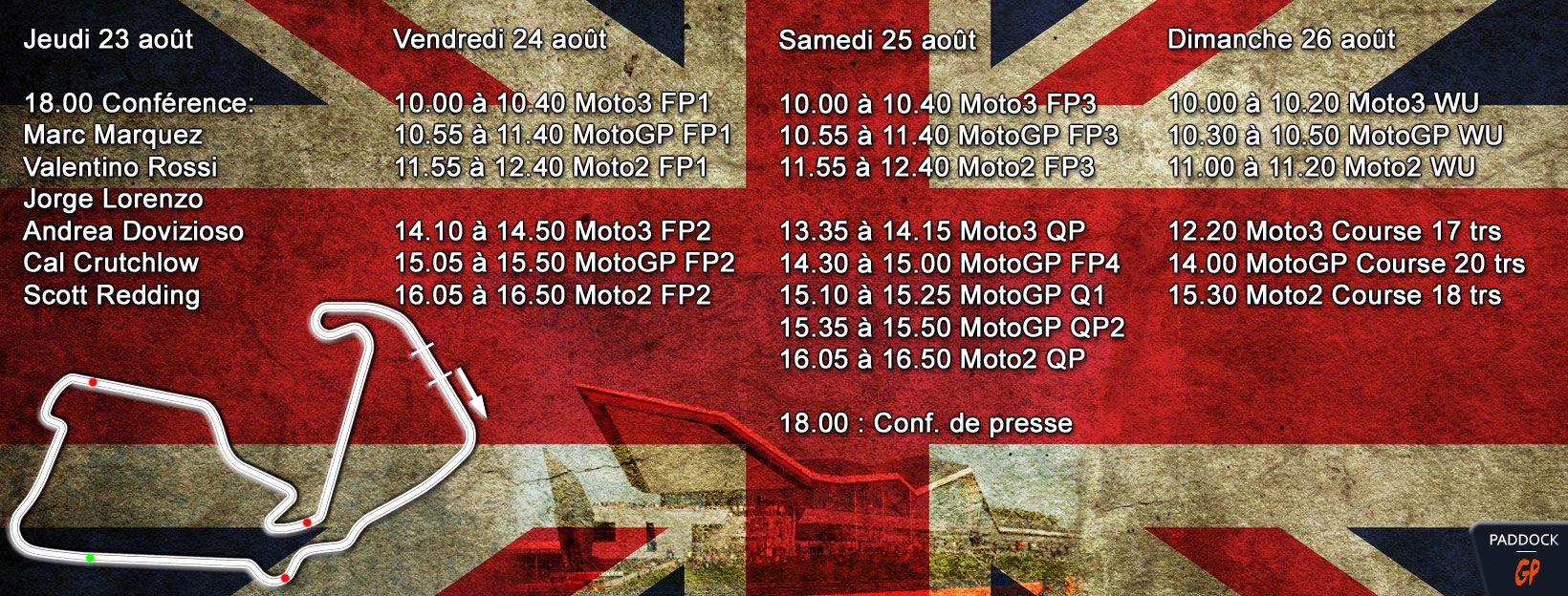 Oyez, oyez braves gens, ce week-end, c’est la perfide Albion qui retiendra notre attention. D’autant plus perfide qu’elle ne fait pas que rouler à gauche. Sa pendule affiche aussi une heure de plus que sur le Continent. Il faudra donc être bien attentif aux horaires pour ne rien manquer. Mieux, pour encore plus nous embrouiller comme leur cuisson des œufs, le programme présente un final avec le Moto2 et non le MotoGP… Shocking !