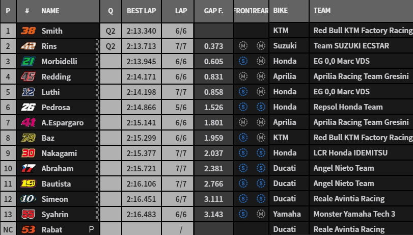 En 2’13.340, Smith montre qu’il tient vraiment à cette Q.2 pour KTM. Il l’aura et poursuivra l’aventure avec Rins qui prive Morbidelli de ce bonheur. Baz sera un bon dix-huitième sur la grille de départ.