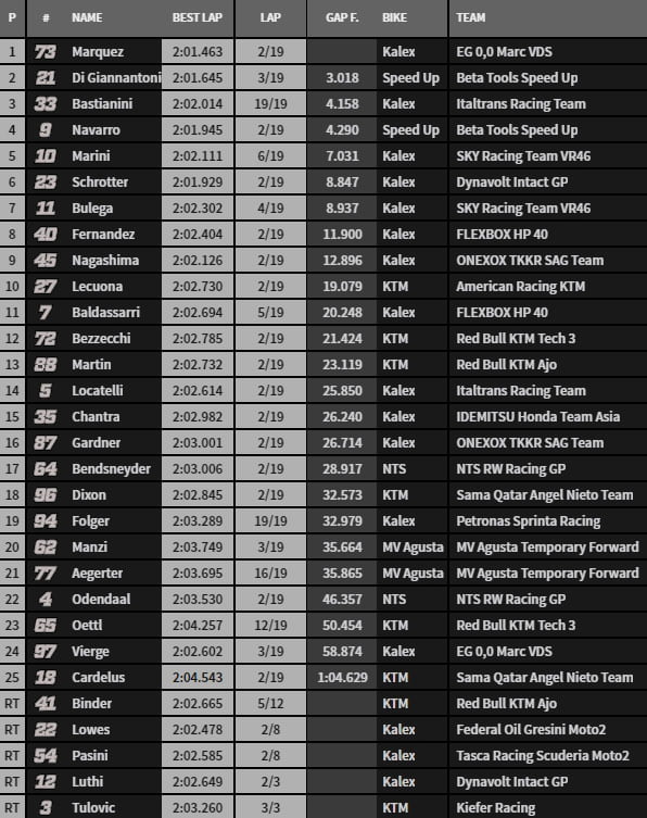 Après cet exploit, Álex Márquez ralentit un peu ce qui permet à Fabio Di Giannantonio de remonter progressivement sur lui, mais le tournant du championnat a peut-être lieu a 46 tours du drapeau à damier, quand Tom Lüthi chute sans gravité en perdant l’avant de sa Kalex au virage #5.