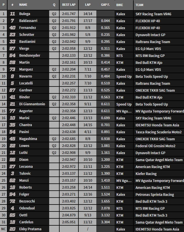 Les choses bougent et Baldassarri sort de la Q2 à cause d’un Jorge Martin qui s’installe second de l’exercice. Sam Lowes est en danger et il est le premier pilote menacé pour se retrouver en Q1. Mais il se sauvera alors que la séance revient à Bulega en 2’01.747. Baldassarri est second, devant son équipier Fernández. Pasini rate la Q2, comme Martin.