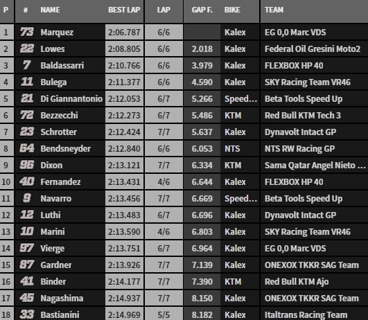 Sous le drapeau à damier, Gardner passe en tête en 2’13.565, devant Bendsneyder, Dixon et le pilote Tech3 Bezzecchi. Le premier éliminé est Martin. Roberts, sixième, regrettera longtemps sa chute. Pasini, seulement dixième de ce groupe, a raté sa prestation.