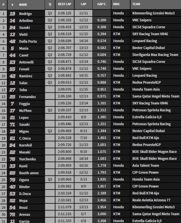 Les cinq dernières minutes sont entamées. Aux temps cumulés, Canet est 14e et Dalla Porta 15e, et donc en Q1… Can Öncü chute au virage 3. Son second accident en deux séances. La dernière minute est intense et chamboule la hiérarchie. Rodrigo rafle ma mise en 2’08.125 avant de chuter dès l’entame du tour suivant au virage 1. Vietti et Dalla Porta s’accroche au virage 3… Il était temps que ça s’arrête !